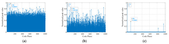 Normalized peak value versus the code phase for various RTCs: (a) RTC = 0.1, PSR = 1; (b) RTC = 0.5, PSR = 1.2; (c) RTC = 0.9, PSR = 2.8.