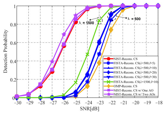 For a CR of 1/2, Figure 6 depicts the detection probabilities of the CS acquisition algorithms versus SNR for various reconstruction schemes. In obtaining Figure 6, the testing Doppler frequency is 180 kHz and the decision threshold of PSR is set for a false alarm probability of 10−4. For measuring the detection performances of the FISTA-reconstructed CS algorithm, the number of iterations is chosen as 5, 10, 20, or 30, with the regularization parameter set to the empirical values of 500 and 1500 [28,45]. These parameter selections are subject to comprehensive considerations, in terms of reconstruction performance, the capability of noise suppression, the real-time requirements of GNSS signal acquisition, as well as the effective assessment of the iteration-dependent acquisition performance [28,34,45]. When both Doppler frequency and code phase are aligned, there exists a single correlation peak for a GNSS signal, leading to a sparsity of one in the simulations of the OMP-reconstructed CS algorithm [21]. As can be seen from Figure 6, compared with the OMP-reconstructed CS algorithm, the effective noise suppressions significantly enhance the detection performances of the NIST-reconstructed CS algorithm and thus the SNR threshold of the NIST-reconstructed CS algorithm is reduced by 3.3 dB at a detection probability of 90%. Such a 3.3 dB improvement of detection sensitivity is robust enough to guarantee the successful acquisition of LEO satellite broadcast high-dynamic GNSS signals obstructed by the plywood wall with a typical attenuation of 2.3 dB [46]. For a regularization parameter of 500, the detection performances of the FISTA-reconstructed CS algorithm improve with an increasing number of iterations. However, for the iteration counts of ≥10, the FISTA-reconstructed CS algorithm becomes trapped in a local optimum, leading to a plateau of its detection performances even with the additional iterations. When the regularization parameter of FISTA is changed to 1500, a further improvement of the detection performances after 10 iterations is observed, in comparison with the case involving a regularization parameter of 500. This is contributed to the fact that, similar to ISTA, the reconstruction performance of FISTA is also strongly dependent on the choice of the regularization parameter [28]. It is evident that a 1.9 dB difference in the SNR threshold is still maintained between the NIST- and FISTA-reconstructed CS algorithms even after 10 iterations of FISTA. In addition, the detection performances of the NIST-reconstructed CS algorithm are further measured with the additional operations (AOs) of a gradient descent and the shrinkage–thresholding, expressed as Equations (23) and (24). It can be seen from Figure 6 that the detection performances of the NIST-reconstructed CS algorithm improve with the growth of the number of AOs at the expense of increased computational complexities. This effectively validates the correct selection of gradient direction in the NIST-reconstructed CS algorithm.