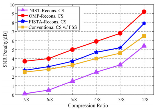 The detection performances of the NIST-reconstructed CS algorithm are further evaluated for various CRs. For the above-mentioned three CS algorithms and the conventional CS algorithm with FSS, Table 3 lists the SNR thresholds of different CRs at a detection probability of 90%. Here, for the FISTA-reconstructed CS algorithm, the regularization parameter and the number of iterations are set to 500 and 20, respectively. The SNR penalty, defined as the SNR threshold difference between the serial search algorithm and the CS acquisition algorithm considered, is plotted as a function of CR in Figure 7, where the Doppler frequency is set to 180 kHz. It is evident that the SNR penalties of all the four CS algorithms increase with the decreasing CR. This is because the intensified compressed measurements inevitably degrade the reconstruction performances. However, compared with the other three CS algorithms, the NIST-reconstructed CS algorithm experiences the lowest SNR penalties for all the CRs due to its effective noise suppression. For a CR of 1/2, the SNR penalty of the NIST-reconstructed CS algorithm is 3.5 dB, 2.1 dB, and 1.4 dB lower than those of its OMP- and FISTA-counterparts as well as the conventional CS algorithm with FSS, respectively. The acquisition result plots of three CS algorithms are shown in Figure 8, with an SNR of −25 dB and a CR of 1/2. As can be seen from Figure 8, the OMP-reconstructed CS algorithm fails to acquire the GNSS signal whilst successful signal acquisitions are observed for the other two CS algorithms. However, in comparison with the NIST-reconstructed CS algorithm, the FISTA-reconstructed CS algorithm exhibits a reduced PSR.