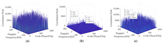 where is the Doppler search index with . After that, by using code phase matrix , frequency offset matrix , and GNSS signal matrix , the correlation inner products indicated in Equation (13) are arranged into a correlation matrix as