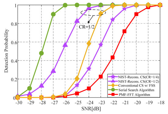 To comprehensively evaluate and exhibit the performance characteristics of the NIST-reconstructed CS algorithm, the L1 C/A code signals, in strict compliance with the interface specification of IS-GPS-200, are adopted to undertake extensive simulation explorations of the acquisition performances for the spread-spectrum signals with a binary phase shift keying (BPSK) modulation. Such a simulation approach has been widely employed for testing the performance of the GNSS signal acquisition algorithms [15,16,17,21,39,40,41]. In the simulations, all the considered Doppler frequencies conform to the JPL Laboratory’s criteria for high-dynamic scenarios [40], with a correlation time of 1 ms. Simultaneously, for comparisons, the acquisition performances are also measured for the OMP- and FISTA-reconstructed CS algorithms, the conventional CS algorithm with FSS, the serial search algorithm, as well as the PMF-FFT algorithm. To ensure the accurate comparisons of the acquisition performances, a random Gaussian matrix is chosen as the measurement matrix for all CS acquisition algorithms whilst the classic decision strategy using the primary-to-secondary peak ratio (PSR) is adopted [40,41]. When calculating the detection probabilities for various acquisition algorithms, 1000 Monte Carlo simulations are performed for each individual SNR and the detection probability is defined as the ratio of the number of successful acquisitions, with both the aligned code phases and the accurately estimated Doppler frequency, to the total number of Monte Carlo simulations.