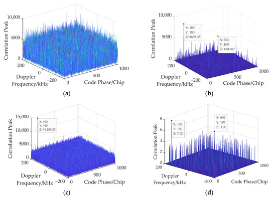As a crucial spatiotemporal infrastructure, the global navigation satellite system (GNSS) provides users with all-weather, full-time, and high-precision information services, including positioning, navigation, and timing (PNT), which plays an important role in the national economy and military defense [1,2,3,4,5]. However, due to the inherent restrictions imposed by the medium Earth orbit (MEO) and geostationary Earth orbit (GEO) satellite constellations, GNSS downlink signals exhibit low received power levels on the ground, significantly degrading the qualities of the PNT services especially in weak-signal environments. Moreover, the low variation in the GNSS satellite geometry prolongs the convergence time for precise point positioning (PPP), which fails to meet the application requirements demanding high real-time performance and precision [6,7]. To address the above-mentioned challenges, multiple navigation augmentation systems emerge, among which low Earth orbit (LEO) navigation augmentation has attracted extensive research interest [1,3,8]. In LEO navigation augmentation systems, GNSS receivers must process the navigation signals broadcast from the LEO satellites. Due to the high orbital velocities of LEO satellites, the reception of GNSS signals is characterized by high dynamics and significant Doppler frequency offsets. Simultaneously, the increasing code phase transition rate necessarily shortens the acquisition window duration and thus increases the acquisition complexities for GNSS signals.