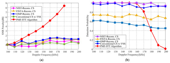 To analyze the robustness of the acquisition performance to different Doppler frequencies, the detection performances of the NIST-reconstructed CS algorithm are measured under the various high-dynamic scenarios with Doppler frequencies ranging from 100 kHz to 200 kHz. Meanwhile, the measurements of the achievable detection performances are also conducted for the CS algorithms with different reconstruction schemes, the conventional CS algorithm with FSS, and the PMF-FFT algorithm for comparisons. Figure 11a shows the Doppler frequency-dependent SNR penalties, which are referred to as the SNR threshold differences between the acquisition of a specific Doppler frequency and that of a 100 kHz Doppler frequency at a detection probability of 90%. In simulating Figure 11a, a CR of 1/2 is exploited for the four CS algorithms whilst the parameter settings of FISTA and PMF-FFT are identical to those adopted in Figure 7 and Figure 9. It can be seen that when the Doppler frequency increases from 100 kHz to 200 kHz, the variations in the SNR penalties are lower than 1.5 dB for all the CS algorithms. In particular, a variation in the SNR penalty is observed as low as 1.3 dB for the NIST-reconstructed CS algorithm. This is inherently contributed to the exhaustive search characteristics for both the code phase and the Doppler frequency within the CS algorithms [11,12]. However, since the amplitude response of the PMF-FFT output exhibits a typical roll-off characteristic, the SNR penalty of the PMF-FFT algorithm increases sharply with the increasing Doppler frequency. Such an excellent performance robustness of the NIST-reconstructed CS algorithm can be further demonstrated in Figure 11b, where the detection probabilities are measured for various Doppler frequencies for an SNR of −25 dB. As shown in Figure 11b, for the Doppler frequencies larger than 160 kHz, the detection probabilities of the PMF-FFT algorithm drop sharply. However, the detection probabilities of the four CS algorithms almost remain stable. Due to its superior noise suppression in the reconstruction of the correlation matrix, the detection probabilities of the NIST-reconstructed CS algorithm are higher than those of other CS algorithms over the whole testing range of the Doppler frequency variation.
