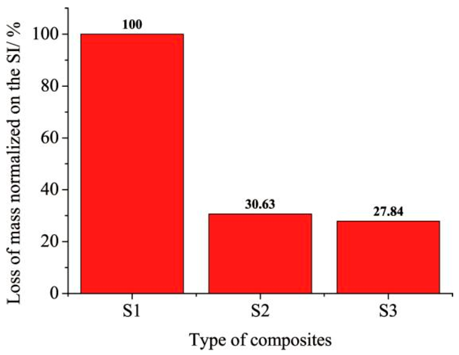 Figure 17. Composites incorporating aramid fibers (S4 and S6) exhibited the lowest mass loss, with residual masses of 87.6% and 85.2% at 1000 °C, respectively, indicating that aramid fibers improve thermal stability. All fiber-reinforced composites displayed a distinct DTG peak in the range of 430–450 °C, suggesting a significant degradation process occurs within this temperature interval.