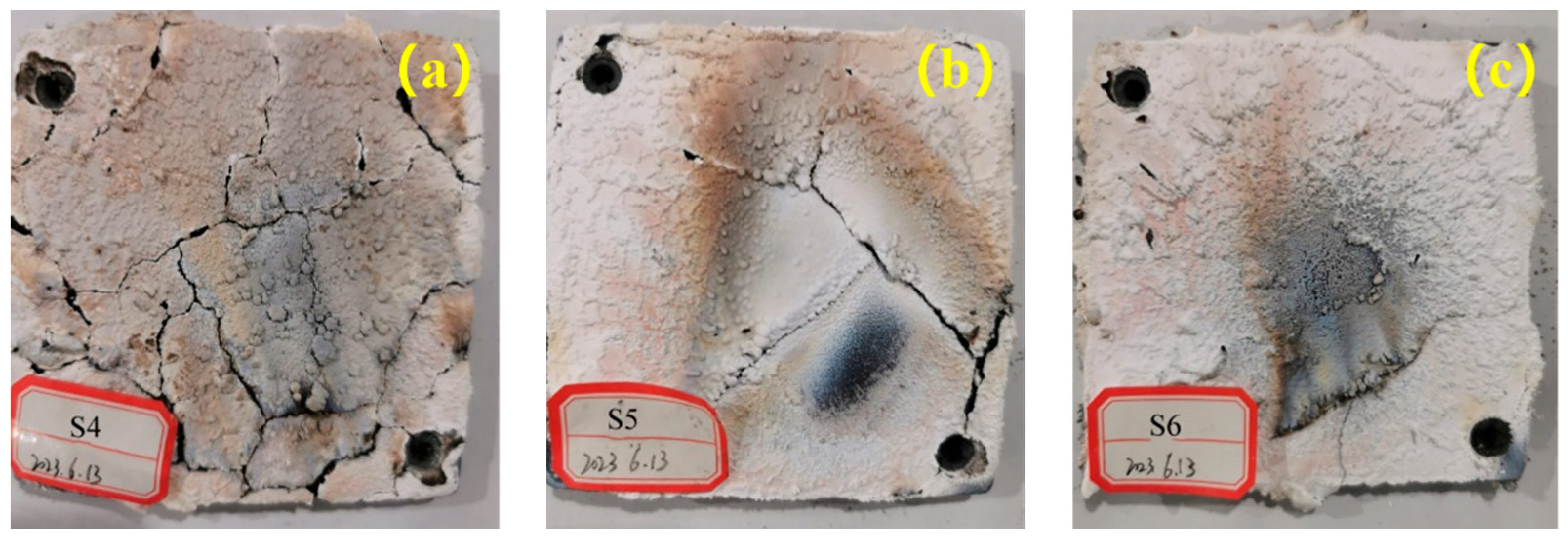 Figure 18). Although the hybrid fiber composite (S6) visually exhibited a more compact char structure (Figure 20c), its mass loss was slightly higher than that of S5. This can be attributed to the oxidative decomposition of the aramid fiber component in S6 under the high-temperature, oxygen-rich environment—an effect schematized in