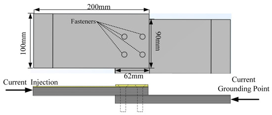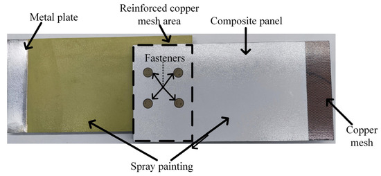 To elucidate the ignition mechanism of composite structures during lightning current conduction, a simplified composite–aluminum lap joint configuration was selected as the research specimen (as shown in Figure 1). The upper composite plate measured 200 mm × 100 mm × 4.5 mm, while the lower aluminum plate measured 200 mm × 100 mm × 3 mm. The two plates were joined using a four-fastener lap joint arrangement. The specimens were fabricated using a co-curing process, achieving functional and structural integration between the copper mesh and the CFRP composites. The 73 g/m2 copper mesh was uniformly applied across the composite surface, and an 815 g/m2 copper mesh was additionally embedded in the fastener region (62 mm × 100 mm) as a protective layer. Finally, a corrosion-resistant epoxy primer was applied to the outer surface to enhance environmental durability and interfacial stability.
