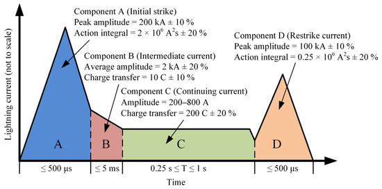 Simulated lightning tests are a common approach for investigating aircraft damage mechanisms and evaluating the direct effects of lightning strikes. To realistically reproduce the conditions of multiple discharge processes during a lightning event, the Society of Automotive Engineers (SAE) Lightning Committee established the standard SAE ARP5412 [8], which specifies the lightning environment for aircraft and defines the corresponding test waveform requirements. This standard has been widely adopted in aircraft testing and certification procedures. The standard lightning current waveform consists of four components, A, B, C, and D, each representing a different stage of a lightning strike. Component A corresponds to the initial stroke current, component B to the intermediate current, component C to the continuing current, and component D to the restrike current. The waveform parameters are illustrated in Figure 2. In addition to the peak current, the transferred charge (Q) and action integral (I) are key parameters for characterizing lightning current waveforms and defined as follows: