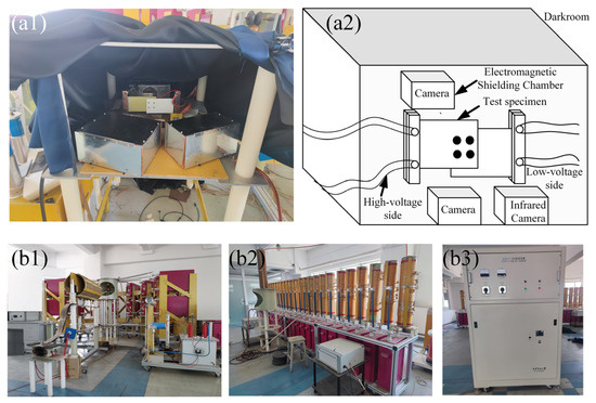 Testing platform: (a1) and (a2) test platforms; (b1–b3) generators for lightning current components A, B, and C.