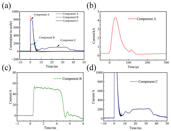 Lightning current waveforms used in the experiments: (a) multiple continuous lightning current components A, B, and C; (b) lightning current component A; (c) lightning current component B; (d) lightning current component C.