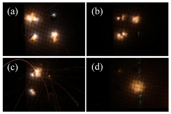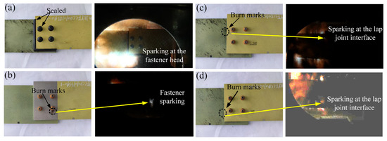 Ignition source photography: (a) interference fit and wet installation (7.048 kA); (b) clearance fit and dry installation (6.739 kA); (c) interference fit and dry installation (4.205 kA); (d) clearance fit and wet installation (13.4 kA).