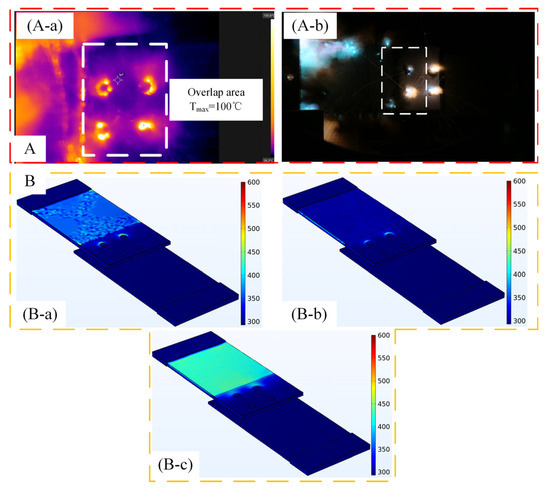 Lightning current parameters 1 (component A: 50 kA, component B: 0.67 kA, component C: 220 A): (A): (A-a) infrared temperature measurement results on the structural upper surface; (A-b) static image information of ignition on the upper surface; (B): (B-a) simulation results of temperature distribution in component A; (B-b) simulation results of temperature distribution at the end of component B; (B-c) simulation results of temperature distribution at the end of component C.