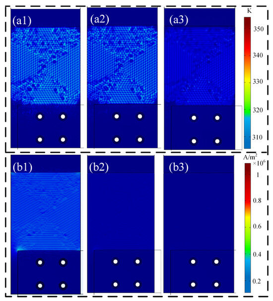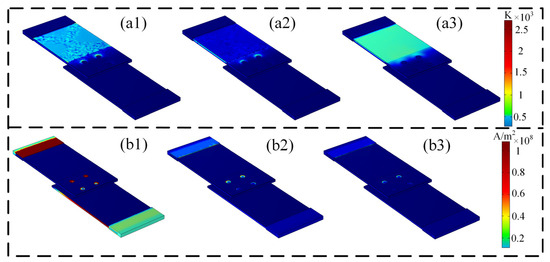 Distribution diagram of the S1 configuration rear side (1: lightning current component A; 2: lightning current component B; 3: lightning current component C); (a1–a3): temperature distribution; (b1–b3): current density distribution. The current peaks for (a1) and (b1) are both 50 kA.