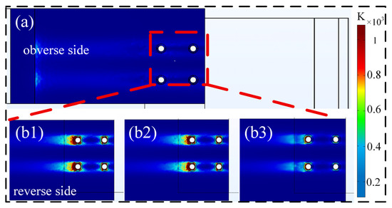 Figure 11 shows the front and back surface temperature distributions of the S1 specimen without the copper mesh. Comparing the distribution diagrams in Figure 11a,b1–b3 shows that the temperature increase on the composite panel surface is significantly lower than that on the back surface. This difference occurs because the removal of the copper mesh alters the current conduction path. Without the copper mesh, the lower wall panel becomes the preferred current flow route. During multiple lightning current transmissions, current predominantly concentrates on the lower wall panel for conduction. After the injection of lightning current components A, B, and C, temperature rises exceeding 1000 K are observed around the fastener. These temperatures surpass the pyrolysis temperature of the composite resin matrix, creating potential ignition sources.