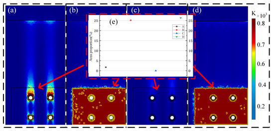 We conducted multiple independent complex experiments for each sample type (S1–S4). Figure 13 clearly illustrates the temperature field distribution obtained for the S4 specimen under three different lightning current peak conditions. As shown in Figure 13, despite different current peaks, the distribution of high-temperature regions, ignition formation locations, and overall thermal response characteristics exhibited high consistency across all experiments. This reproducible pattern across varying energy levels strongly demonstrates that the observed phenomena are not coincidental but rather inevitable outcomes determined by the intrinsic physical properties of the samples.
