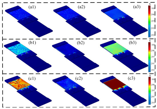 Temperature distribution of specimen S4 under various lightning current components: (1) component A, (2) component B, and (3) component C; (a1–a3) current peak: 5.5 kA; (b1–b3) current peak: 8.6 kA; (c1–c3) current peak: 13.4 kA.