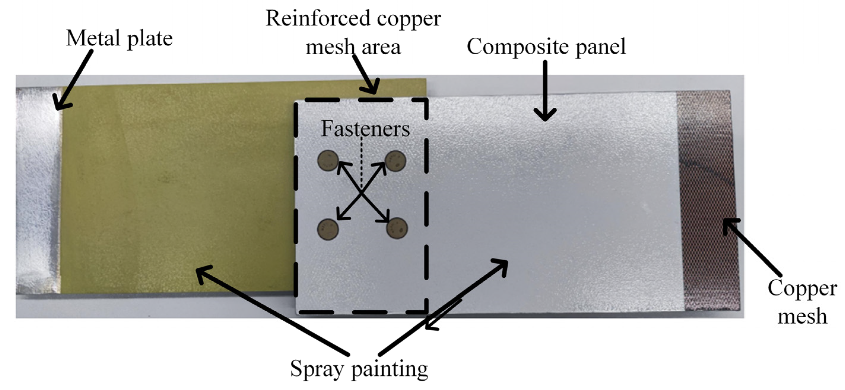 Figure 1). The upper composite plate measured 200 mm × 100 mm × 4.5 mm, while the lower aluminum plate measured 200 mm × 100 mm × 3 mm. The two plates were joined using a four-fastener lap joint arrangement. The specimens were fabricated using a co-curing process, achieving functional and structural integration between the copper mesh and the CFRP composites. The 73 g/m