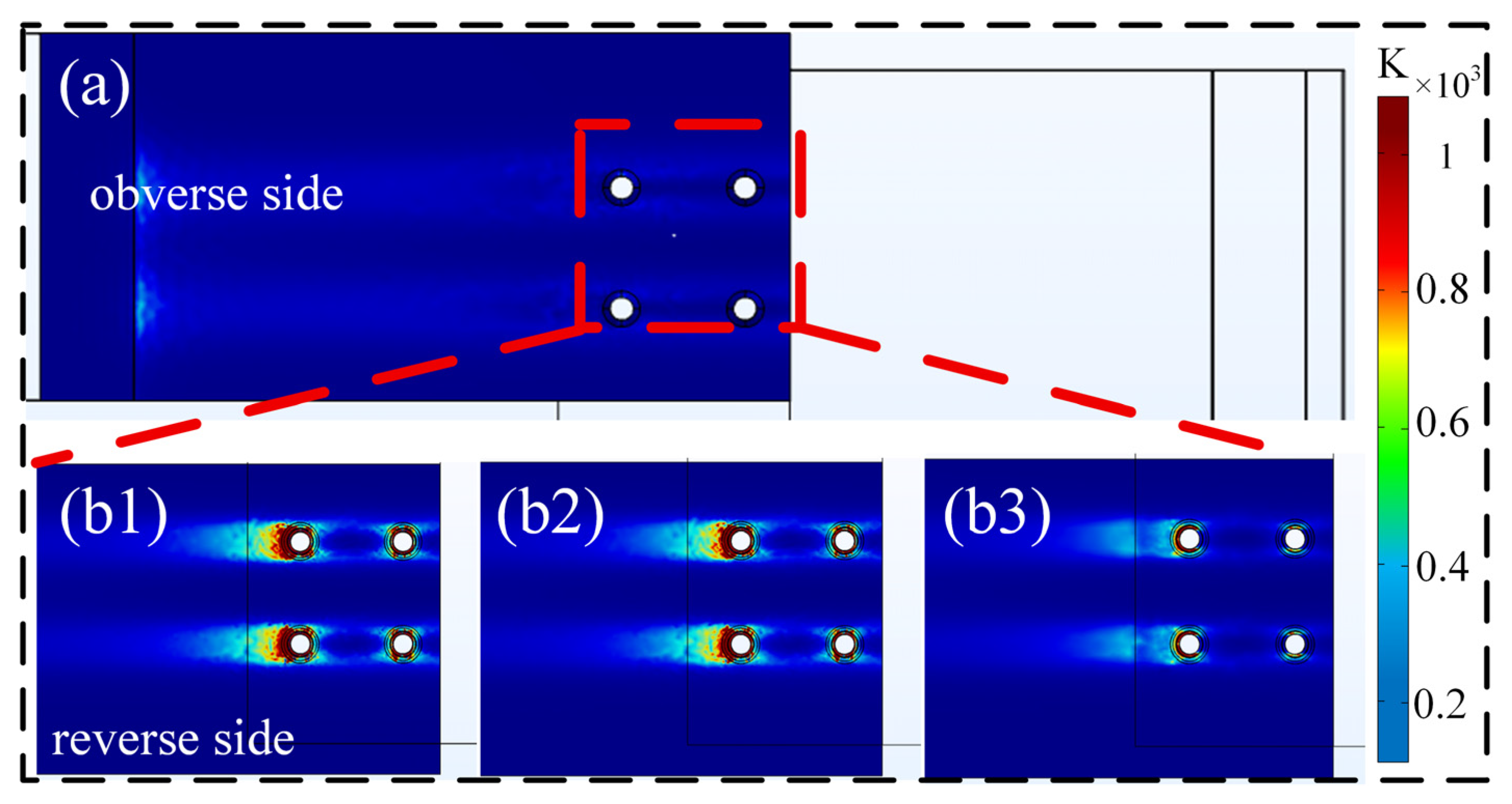 Figure 13 clearly illustrates the temperature field distribution obtained for the S4 specimen under three different lightning current peak conditions. As shown in