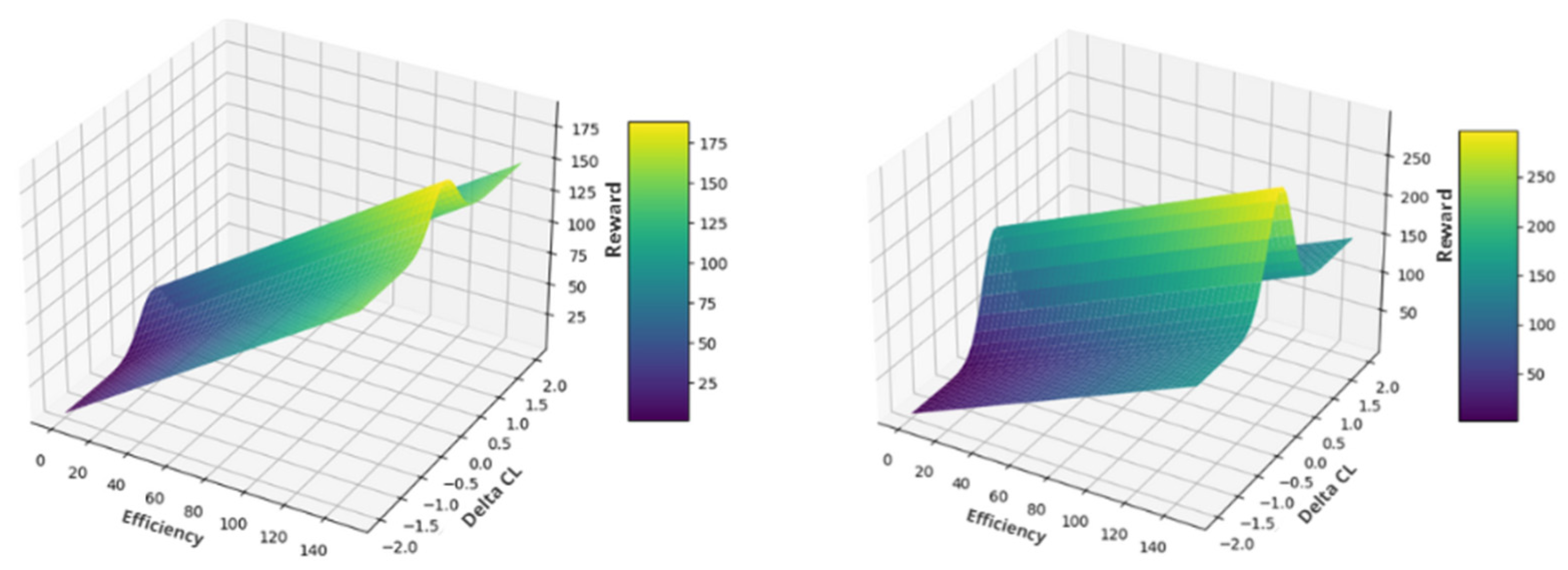 Comparison of CL target with the CL obtained using the reward function 9. The parameters of the equation are α = 1, β = 80 and γ = 15. The results of the highest rewards are shown for each case.