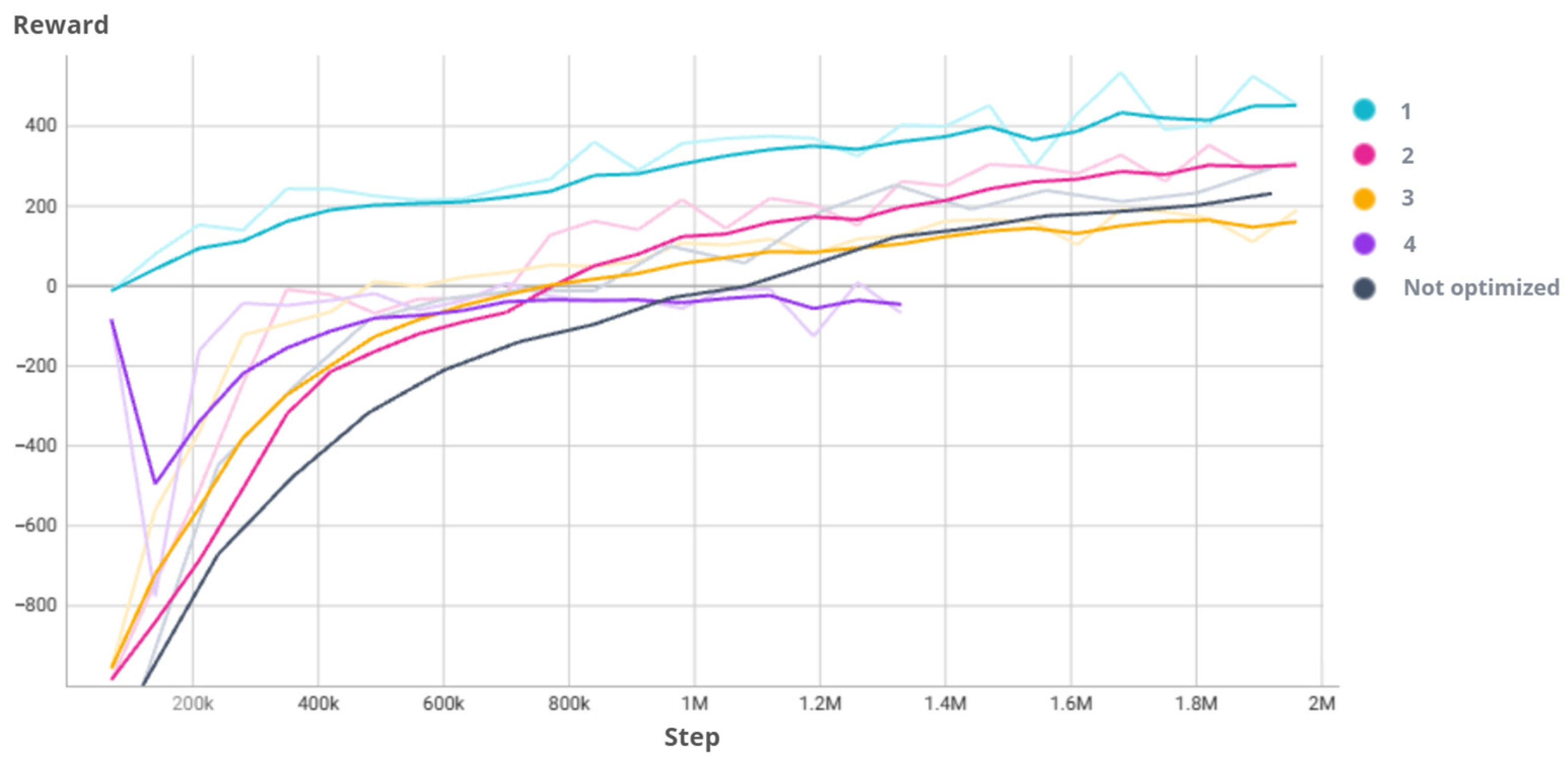 Comparison of the rewards obtained after 600,000 steps. The six best resulting models are shown, as well as the unoptimized model used so far.