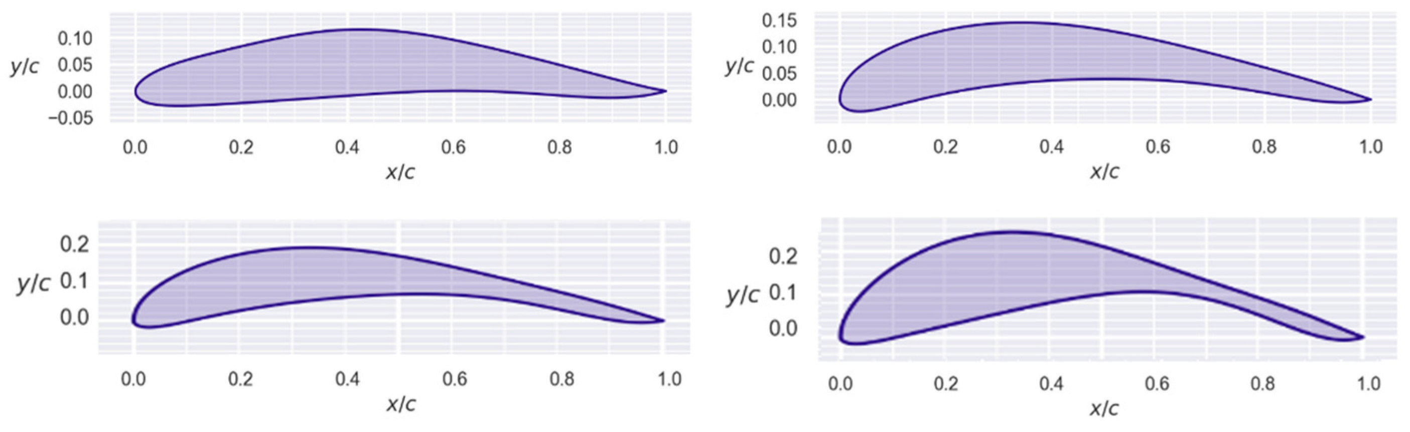 Airfoils generated with a CL target of 0.4 and Reynolds number of 10,000,000.