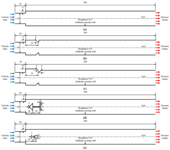 The physical models of five channels equipped with typical ramjet flameholders. (a) Case 1; (b) Case 2; (c) Case 3; (d) Case 4; (e) Case 5.