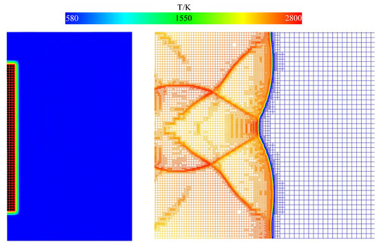 The two-dimensional transient Reynolds-averaged Navier–Stokes equations (RANS) were solved in this study. The numerical simulation was carried out based on ANSYS Fluent 17.1 software. The chemical reaction mechanism adopted in this study was the 8-species and 19-step H2 mechanism proposed by Westbrook [47]. The standard k-ε turbulence model using the Eddy Dissipation Concept (EDC) was employed in all simulations, which was put forward by Magnussen in 1981. The effects of turbulence and detailed chemical reactions were considered in the reaction flow, and the reactions in the flow process were determined by the Arrhenius formula. This model had obvious advantages for the simulation of a detailed reaction mechanism, and the model constants were as follows: Cmu was 0.09, C1-Epsilon was 1.44, C2-Epsilon was 1.92, TKE Prandtl Number was 1, TDR Prandtl Number was 1.3, Energy Prandtl Number was 0.85, Wall Prandtl Number was 0.85, and Turb. Schmidt Number was 0.7. The second-order implicit scheme was used, and the solution method of Pressure Implicit with Splitting of Operators (PISO) was adopted due to the unsteady detonation process. This algorithm was put forward by Issa in 1986, and the widely used SIMPLE algorithm was modified by one step, which improved the convergence speed and had more obvious advantages in unsteady calculation. In the calculation, the second-order implicit scheme was used to discretize the time and space direction, respectively, and the fixed time step method was used for iterative calculation. The time step was 10−7 s. The adaptive mesh refinement method was applied to refine the local mesh in regions with significant temperature gradients. The small-scale fine grid was used to calculate the physical parameters with large range and drastic change, and the large-scale coarse grid was used to calculate the physical parameters with slow change, which saved the calculation cost and effectively improved the calculation accuracy. The refined grids of numerical simulation all utilized adaptive grids with refinement level 3, that is, grids of 0.25 mm, 0.125 mm, and 0.0625 mm. The gas was assumed to be an ideal gas [2,12,18,48], and a stoichiometric mixture of hydrogen/air was used as the combustible mixture. The inlet parameters of the channel were determined based on the inlet parameters of the ramjet combustor at a flight altitude of 18 km and a flight Mach number of 3. The initial pressure and temperature of the stoichiometric mixture were set to 0.17 MPa and 582 K, respectively. During the filling process, the inlet of the channel was opened as a velocity inlet, and the inflow velocity of the stoichiometric mixture was 0.3 Ma. After the filling process, the inlet of the channel was closed as a thrust wall, and a high-temperature ignition zone was arranged close to the inlet. Figure 2 shows the ignition zone and diagram of adaptive mesh refinement changes with temperature.