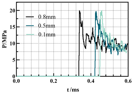 To verify the reliability of the simulation results, comparisons were made between the simulation results and the experimental results of the available documents and the Chapman–Jouguet (C-J) gaseous detonation wave parameters. The detonation pressure, detonation temperature, and detonation wave velocity were all compared. Furthermore, the validation of grid independence in this study referred to the published reference [48,49]. Figure 3 shows the pressure distribution at the same monitoring point under different grid sizes. It can be seen from the figure that the pressure change trend at the monitoring point was basically the same under different grid sizes. The calculation results of the grid size of 0.8 mm were obviously different from those of 0.5 mm, but the pressure curves of 0.1 mm and 0.5 mm were basically consistent. Considering the significantly higher computational expense and time required for the 0.1 mm grid and the lower accuracy for the grid of 0.8 mm, a grid size of 0.5 mm was selected for this paper to investigate the filling and detonation initiation characteristics in a PD-Ramjet.