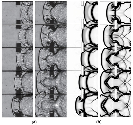 Gaby et al. [50] carried out an experimental study on the flame acceleration process in an obstructed narrow rectangular channel, and the schlieren image is shown in Figure 4a. The figure clearly shows the development process of flame, vortex, and shock wave among obstacles, and it also shows the complex interaction process between shock waves and between shock waves and flame. Figure 4b showed the flame acceleration process in the narrow rectangular channel calculated by the above calculation method. It could be clearly observed that the flame front, vortex, and shock wave structures were highly similar to the experimental results, and the accelerated evolution process of the flame could be clearly captured. Therefore, the numerical simulation method used in this paper was accurate and reliable.