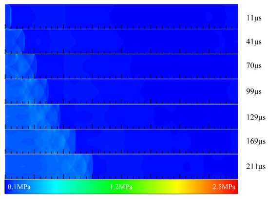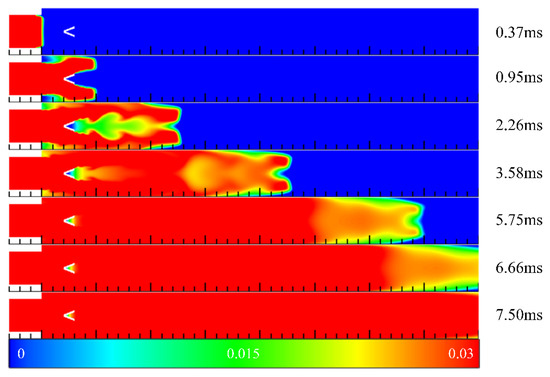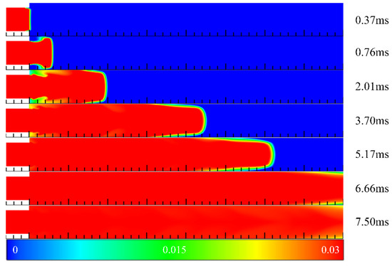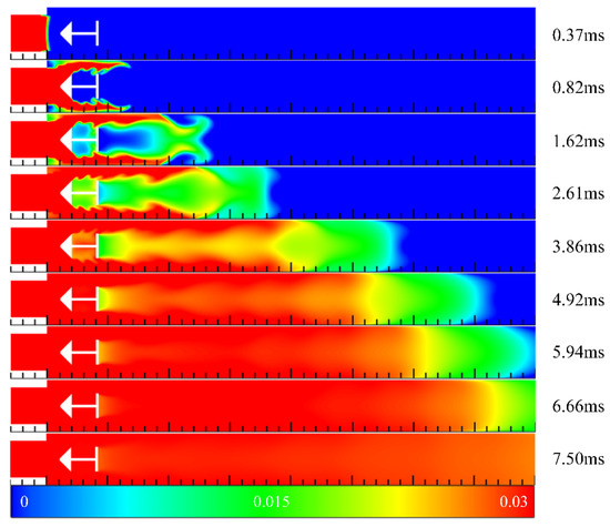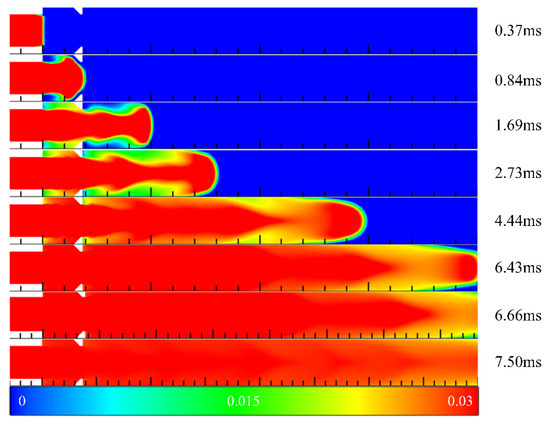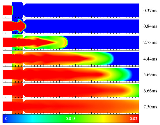 Figure 7 illustrates the contours of hydrogen mass fraction in the filling process in Case 3 at different times. Compared with Case 2, the cavity was extended to the outside of the channel, and the aft wall inclination angle was 90°. Similarly, at t = 0.37 ms, the front end of the mixed gas was introduced into the channel. However, due to the different depth of the cavity and the inclination angle of the cavity aft wall, the subsequent filling process differed significantly from Case 2. The inclination angle of the cavity aft wall affected the concentration distribution in the front end of the mixed gas. When the cavity aft wall inclination angle was 45°, the high concentration region of the front end presented an arc shape. However, it was close to a sharp cone shape when the inclination angle was 90°. Compared with the contours of 2.73 ms in Case 2 and Case 3, the leading edge of mixed gas reached a position of 163 mm in Case 2. Whereas the propagation velocity of the front end in Case 3 was higher than that in Case 2 due to the sudden contraction of the flow path caused by the cavity aft wall, and the leading edge of mixed gas had reached a position of 178 mm in Case 3. As such, the hydrogen concentration of the front end was lower than that in Case 2, which could be clearly seen from Figure 6. Finally, at t = 6.66 ms, the hydrogen concentration in the cavity was basically the same as that in the mainstream, whereas the hydrogen concentration was low near the outlet of the channel.