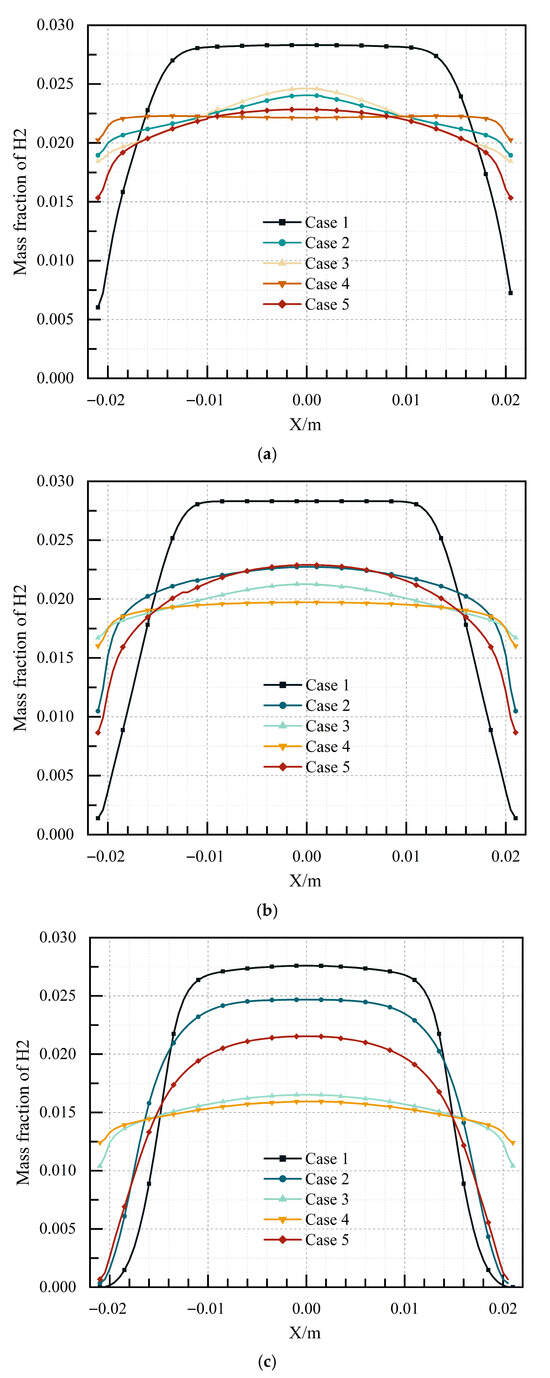 The hydrogen concentration at the 350 mm, 370 mm, and 400 mm sections in five channels at t = 6.66 ms. (a) 350 mm section; (b) 370 mm section; (c) 400 mm section.
