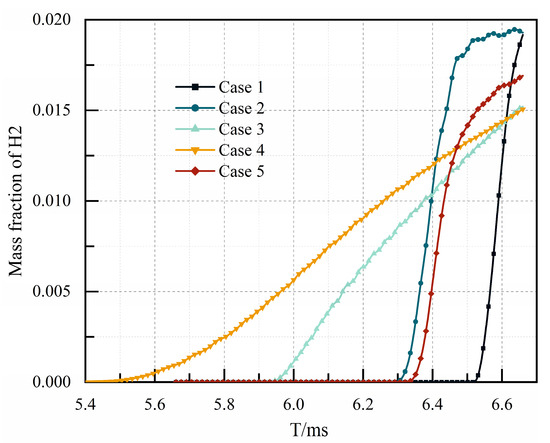 Figure 11 illustrates the average hydrogen concentration at the 400 mm section in five channels from 5.4 ms to 6.66 ms, which reflects the hydrogen discharged from the outlet of the channel at different times directly. Due to the huge blockage caused by the central cavity, hydrogen was first discharged from the outlet of the channel in Case 3, followed by Case 2 with the sudden expansion cavity. The last was Case 1 without any flameholder. As shown in the figure, the hydrogen concentrations of Case 3 and Case 4 were basically the same at t = 6.6 ms. It could be inferred that the hydrogen volume discharged from the outlet of the channel in Case 4 was more than that in Case 3. Similarly, the hydrogen volume discharged in Case 2 was more than that in Case 1. In terms of energy saving, the V-shaped groove was better than the single cavity, and the sudden expansion cavity was better than the central cavity. In addition, the blocking ratio in both Case 3 and Case 4 was 0.28. However, the time for mixed gas to reach the outlet of the channel in Case 3 was faster than that in Case 4. Hence, the time for mixed gas to reach the outlet was related to the cavity aft wall inclination angle, to a certain extent.