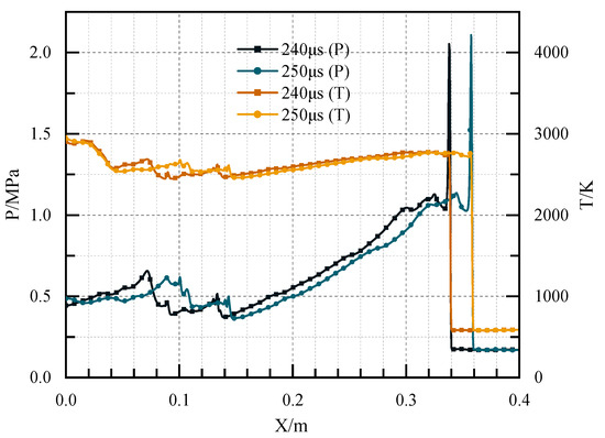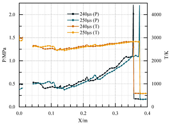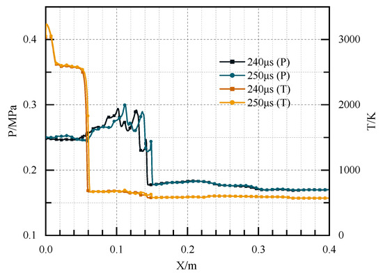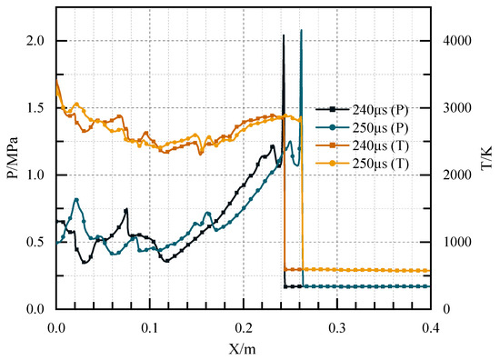 The pressure and temperature distribution at the central axis in Case 4 at 240 μs and 250 μs.