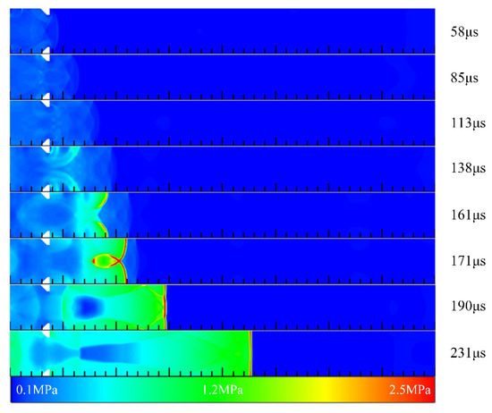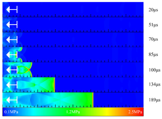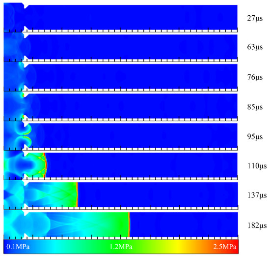 After the filling process, the inlet of the channel was closed as a thrust wall, and a 30 mm × 2 mm rectangular high-temperature ignition zone was arranged close to the inlet. The initial pressure and temperature of the stoichiometric mixture in the ignition zone were set to 0.17 MPa and 3000 K, respectively. The ignition and detonation initiation processes in different channels were studied.