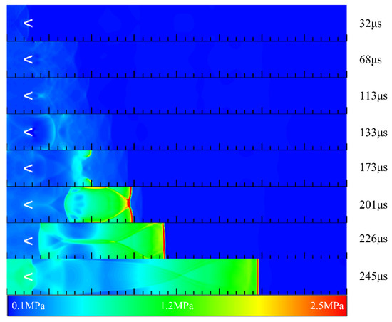 Figure 20 illustrates the contours of pressure in Case 5 at different times. The compression waves at the front end reached the leading edge of the V-shaped groove at t = 32 μs and were reflected around. The reflected wave interacted with the transverse wave formed by the two side walls, and the pressure rose. After propagating through the V-shaped groove, the reflected waves and the transverse waves converged near the central axis, resulting in the formation of a high-pressure region. As they propagated forward, two high-pressure points were formed with a pressure of 0.85 MPa near both sides of the wall. However, the pressure of these high-pressure points was not as high as in the previous cases. As such, the pressure gradually advanced during the propagation process downstream, forming a high-pressure region. Finally, a plane detonation wave was generated at a position of 190 mm at t = 245 μs, and the detonation wave was stable at t = 301 μs. Figure 21 shows the pressure and temperature distribution at the central axis in Case 5 at different times. Manifested in the figure, the position of the wave front was about 182 mm at t = 240 μs. At this time, the detonation wave was not completely stable, and the pressure of the wave front was still in the decline stage. Subsequently, a stable detonation wave was generated at t = 320 μs. The pressure of the detonation wave was 2.2 MPa, and the temperature of the detonation wave was 2831 K. Calculated from the figure, the velocity of the detonation wave was 1927 m/s.