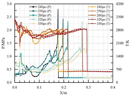 Figure 12 shows the contours of pressure in Case 1 at different times. The pressure waves rapidly propagated to both sides of the channel after ignition and were reflected. Since there were no obstacles in the channel to form a strong wall reflection, the compression wave propagated and diffused in an approximately unconfined space, and the pressure attenuated. Figure 13 illustrates the pressure and temperature distribution at the central axis in Case 1 at 240 μs and 250 μs, respectively. As shown in the figure, the flame front could not catch up with the pressure wave, and the pressure front and the temperature front had been decoupled at this time. The speed of the pressure wave was far lower than the C-J speed, and the detonation initiation failed.