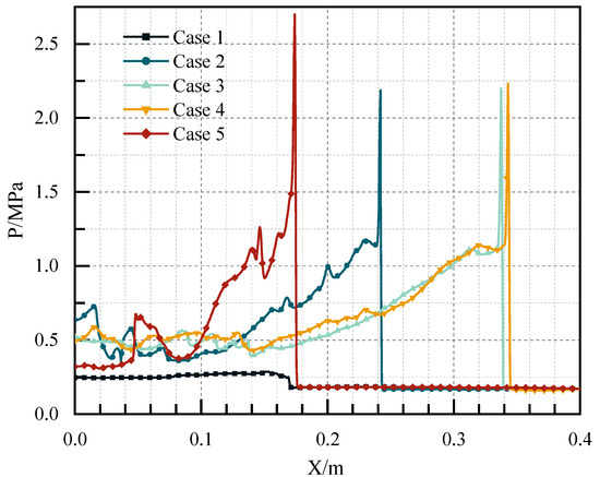 Figure 22 reveals the pressure distribution at the central axis in the five channels at t = 240 μs. In addition to Case 1, stable and self-sustained detonation waves were generated in all other Cases. Although the filling effect was good in Case 1, the detonation wave could not be initiated without flameholders. The flameholders promoted the generation of a detonation wave. Moreover, different flameholders would change the time and position of high-pressure point formation, and the position of the high-pressure point formed by the sudden expansion cavity was the earliest. The detonation wave pressure in Case 4 with the central cavity structure was the largest, and the time for generating the stable detonation wave was the shortest, followed by Case 3 with the sudden expansion of the cavity, and Case 5 with a V-shaped groove was the longest. Essentially, there were both sections in the channels in Case 3 and Case 4, where the blocking ratio suddenly increased. The pressure rose sharply after the reflected wave passed through these sections, which promoted the generation of a high-pressure region. This explained the fast generation of the detonation wave in Case 3 and Case 4. For Case 5, as depicted above, the position of the wave front was about 182 mm at t = 240 μs, which was far less than the above cases, and the detonation wave was not completely stable at this time.