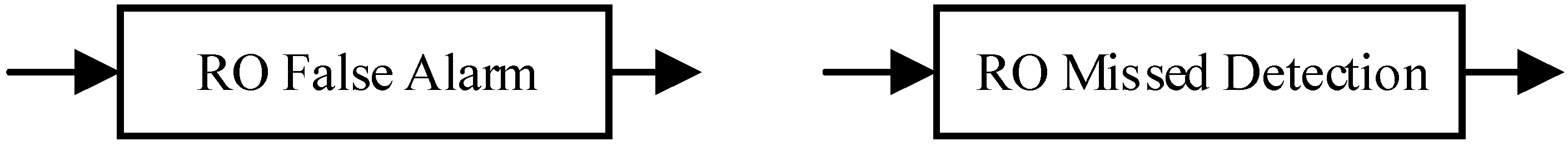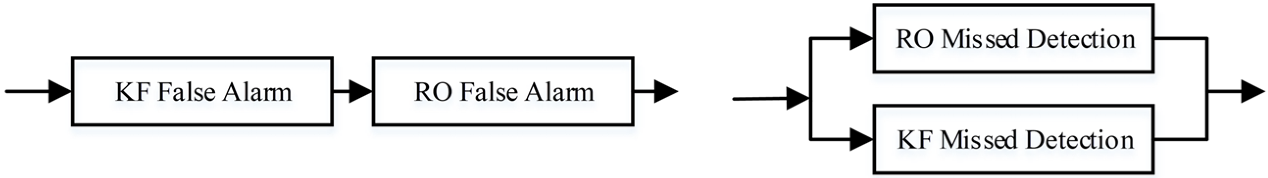 - Based on the combination of the Kalman filter and robust observer, the reliability calculation of the alarm detection mechanism (OR voting) is as follows, and the corresponding reliability diagram of false positives and false negatives is shown in Figure 11.