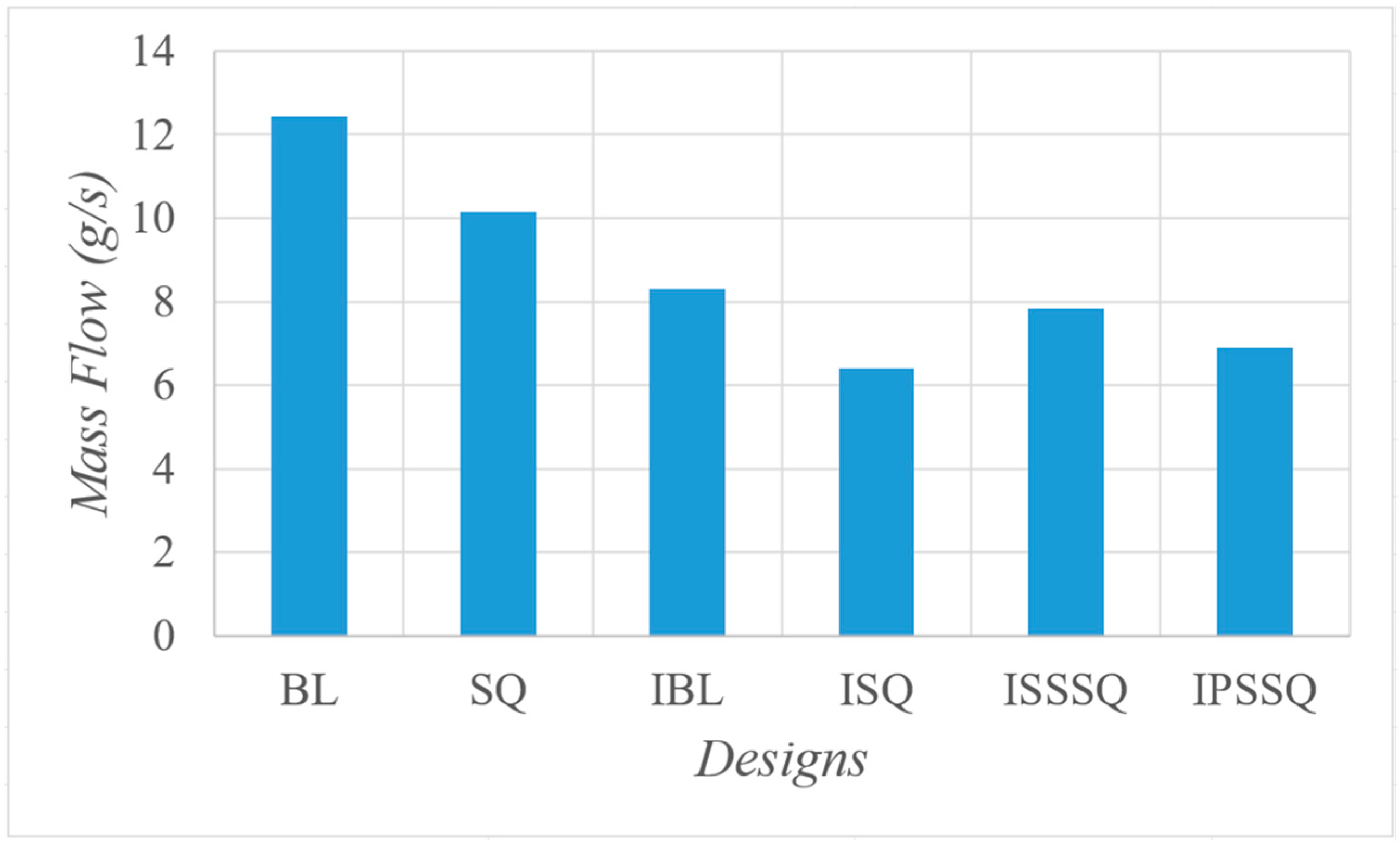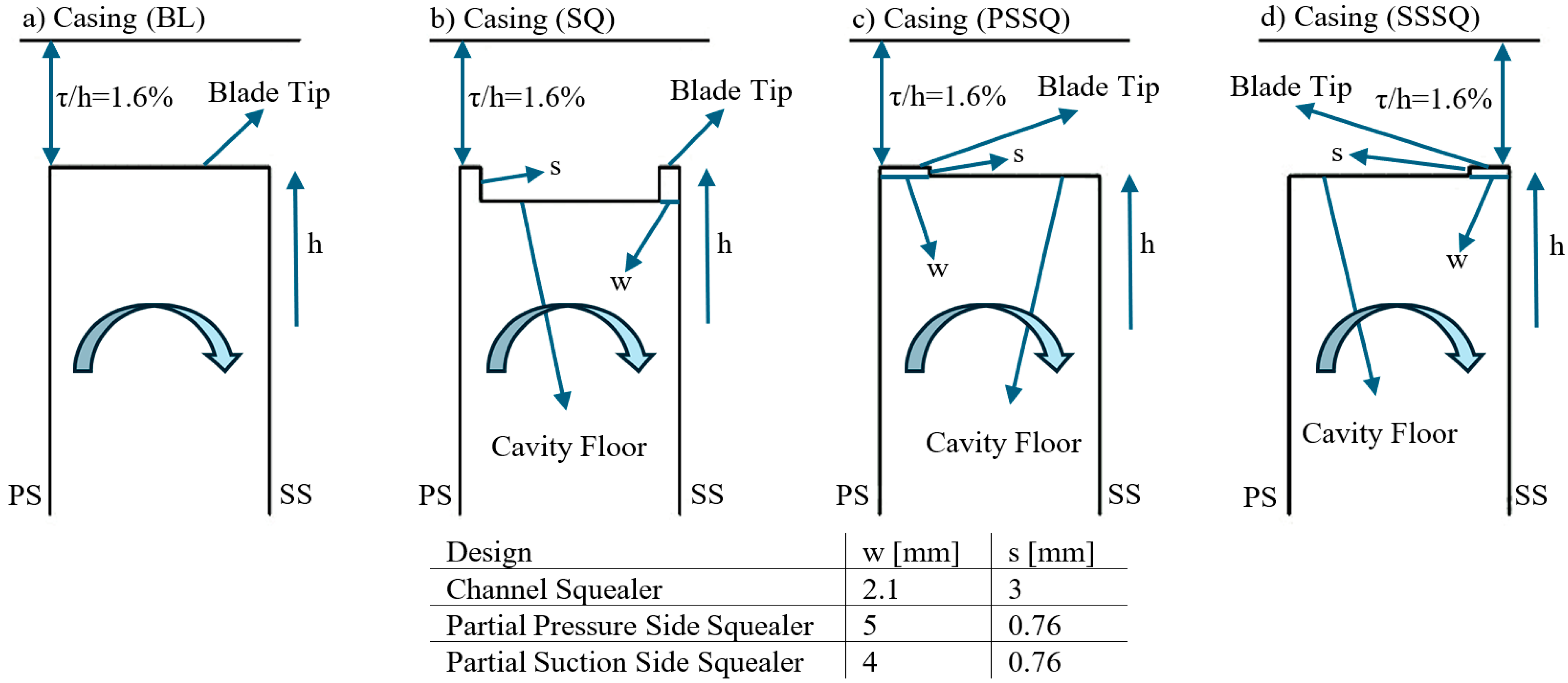 Table 6. ε, ϑ and Г show the normalized difference in total pressure loss coefficient, isentropic total-to-total efficiency and average heat transfer coefficient at blade tip, respectively, between baseline and related design. To create a clear image of the injection effect with recessed tips, channel squealer (SQ) results without injection are also provided. ISSSQ and IPSSQ stand for suction side and pressure side squealers plus injection, respectively. In comparison to the baseline, results show that the injection with a channel squealer tip (ISQ) achieves the best performance in all aspects, with a decrement of 2.87% and 4.91% in total pressure loss coefficient and tip