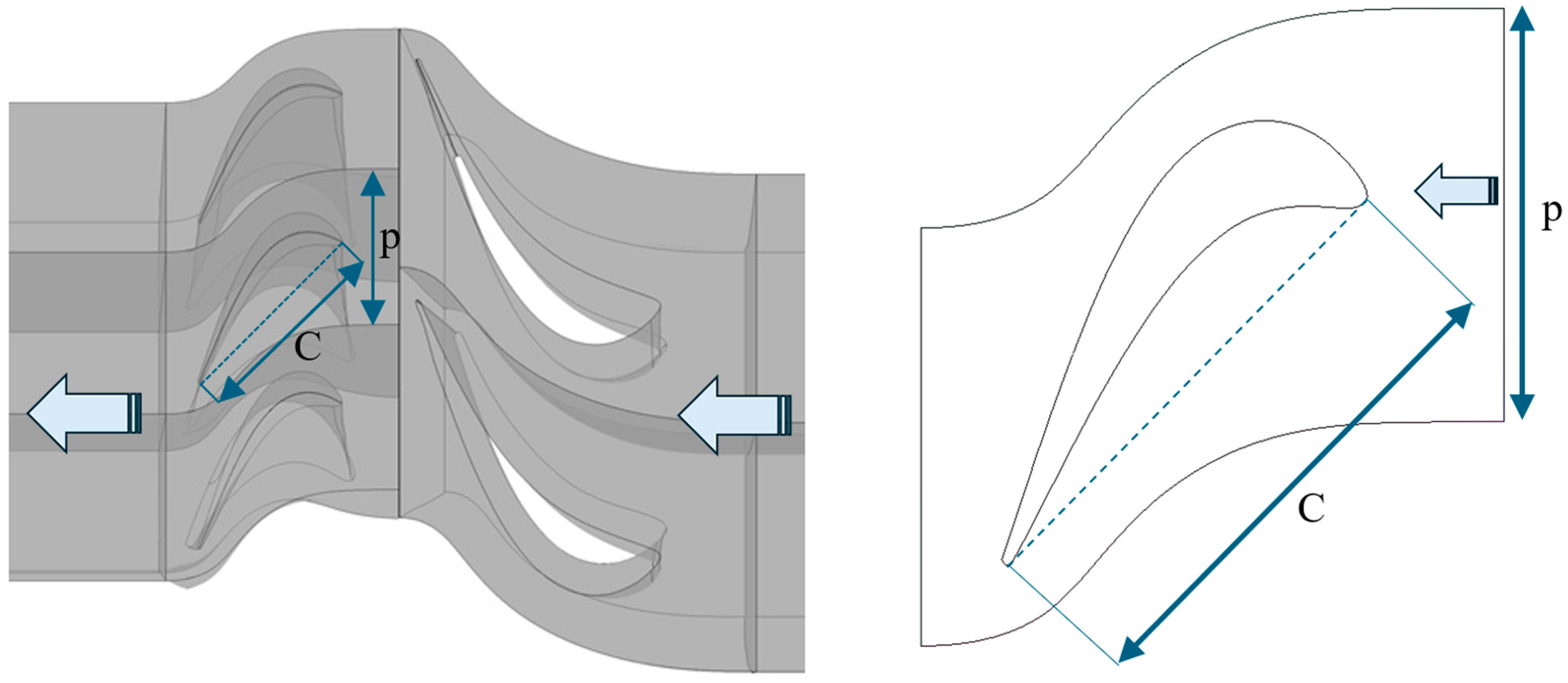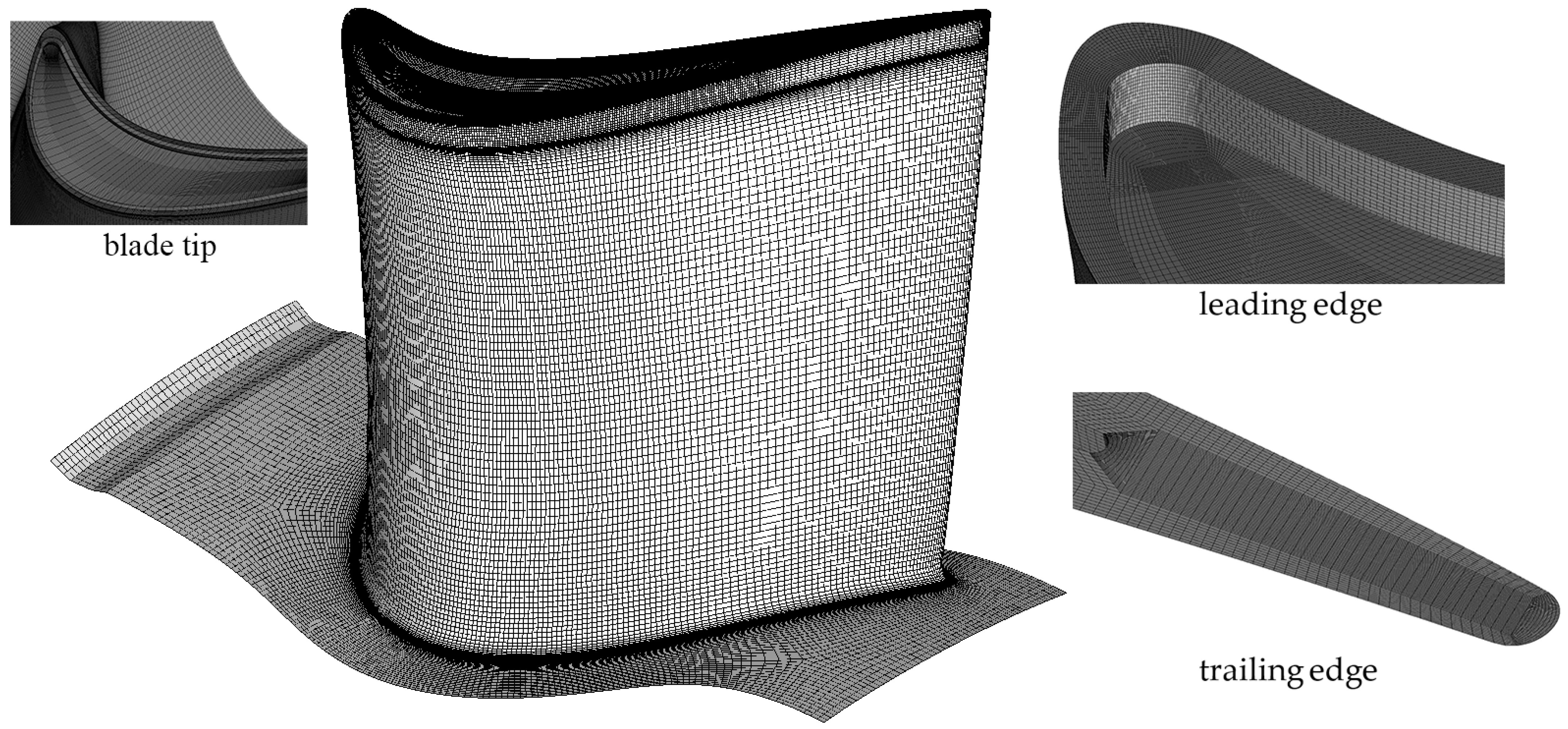 Each injection configuration is represented by a five-parameter set in the form Cx-A-M-D-N, denoting the axial injection location, injection angle, blowing ratio, hole diameter, and number of injection holes, respectively. For example, the case 0.3-30-1.22-0.7-7 corresponds to injection at 30% of the axial chord with a 30° hole inclination, a blowing ratio of 1.22, a hole diameter of 0.7 mm, and seven holes in each pitch.