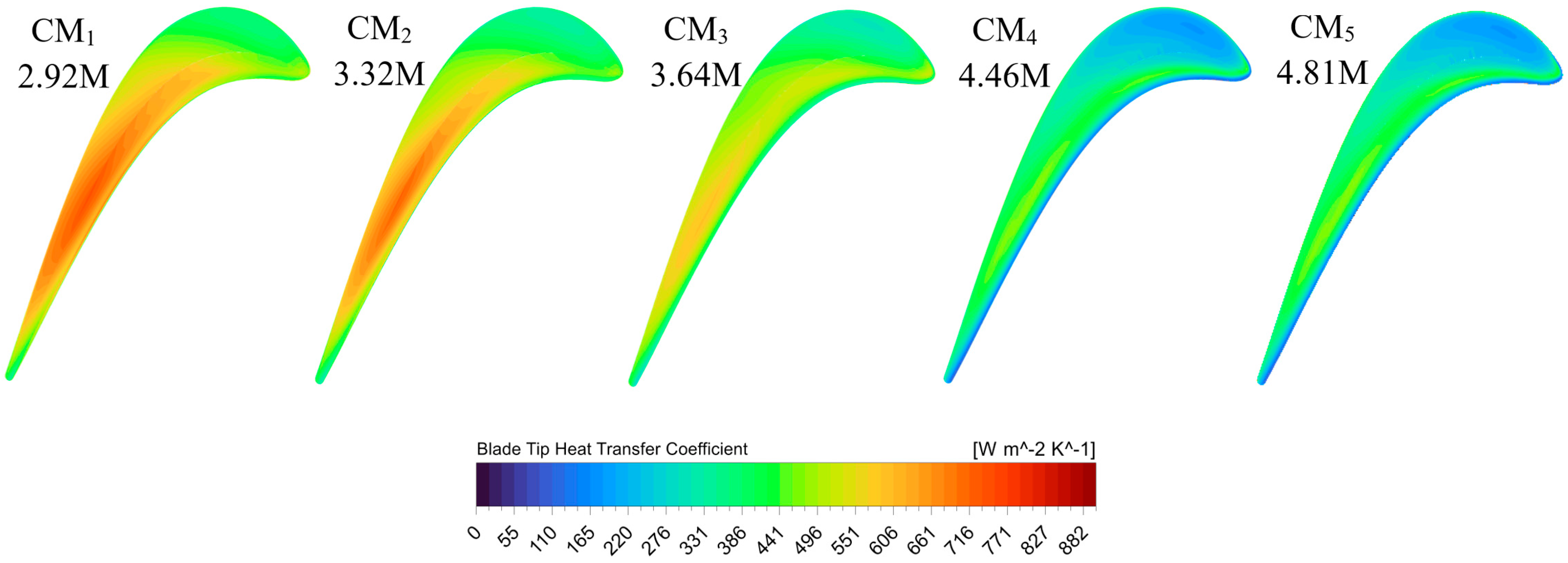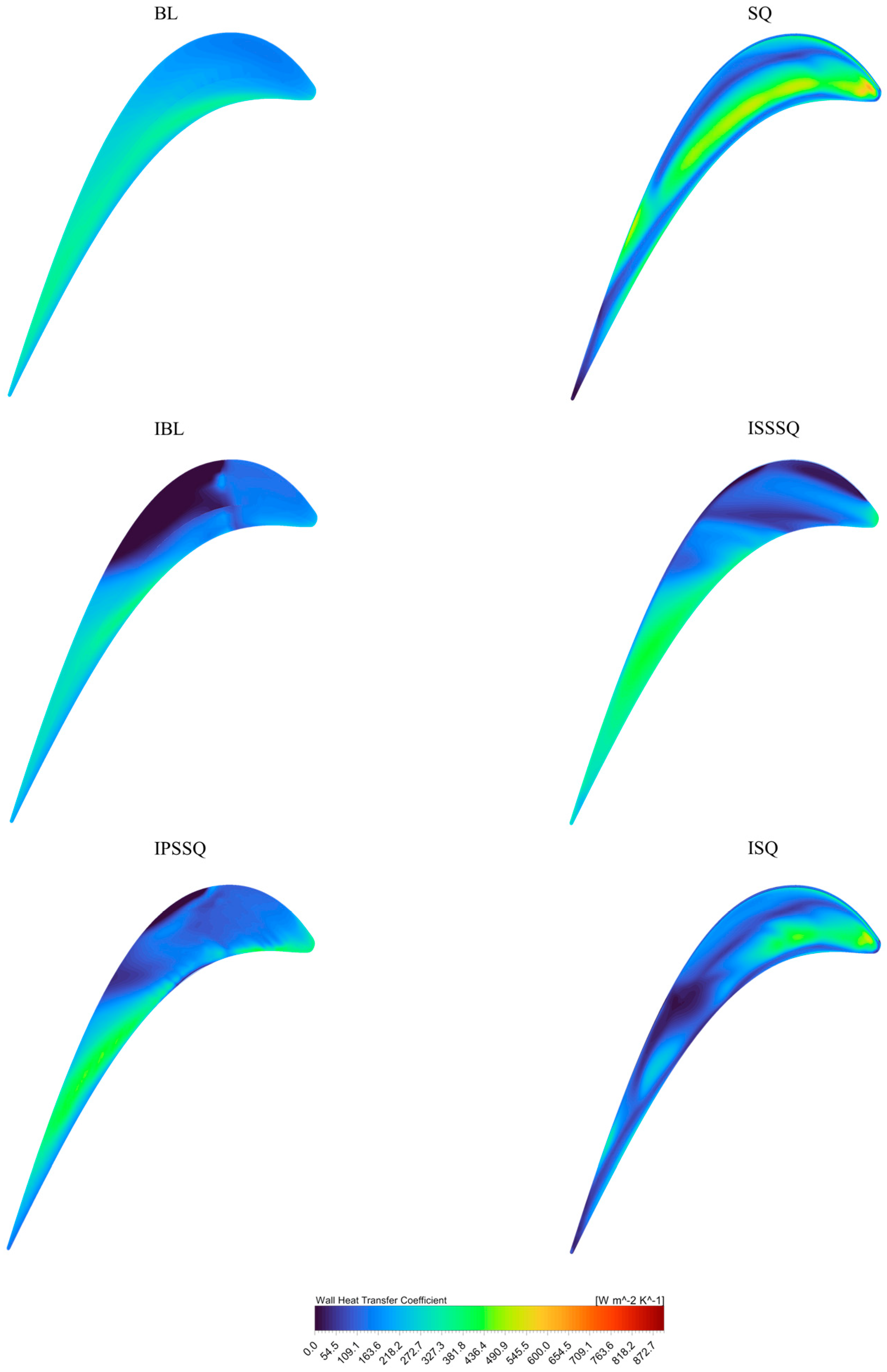 h) of inspected tip designs. All the contours have been created with the same value range at the blade surface. The BL tip’s heat-transfer coefficient map is relatively uniform and moderate. The highest heat transfer occurs near the trailing edge suction side, where the main leakage flow vortex is present. In contrast, the leading-edge region on the pressure side shows lower