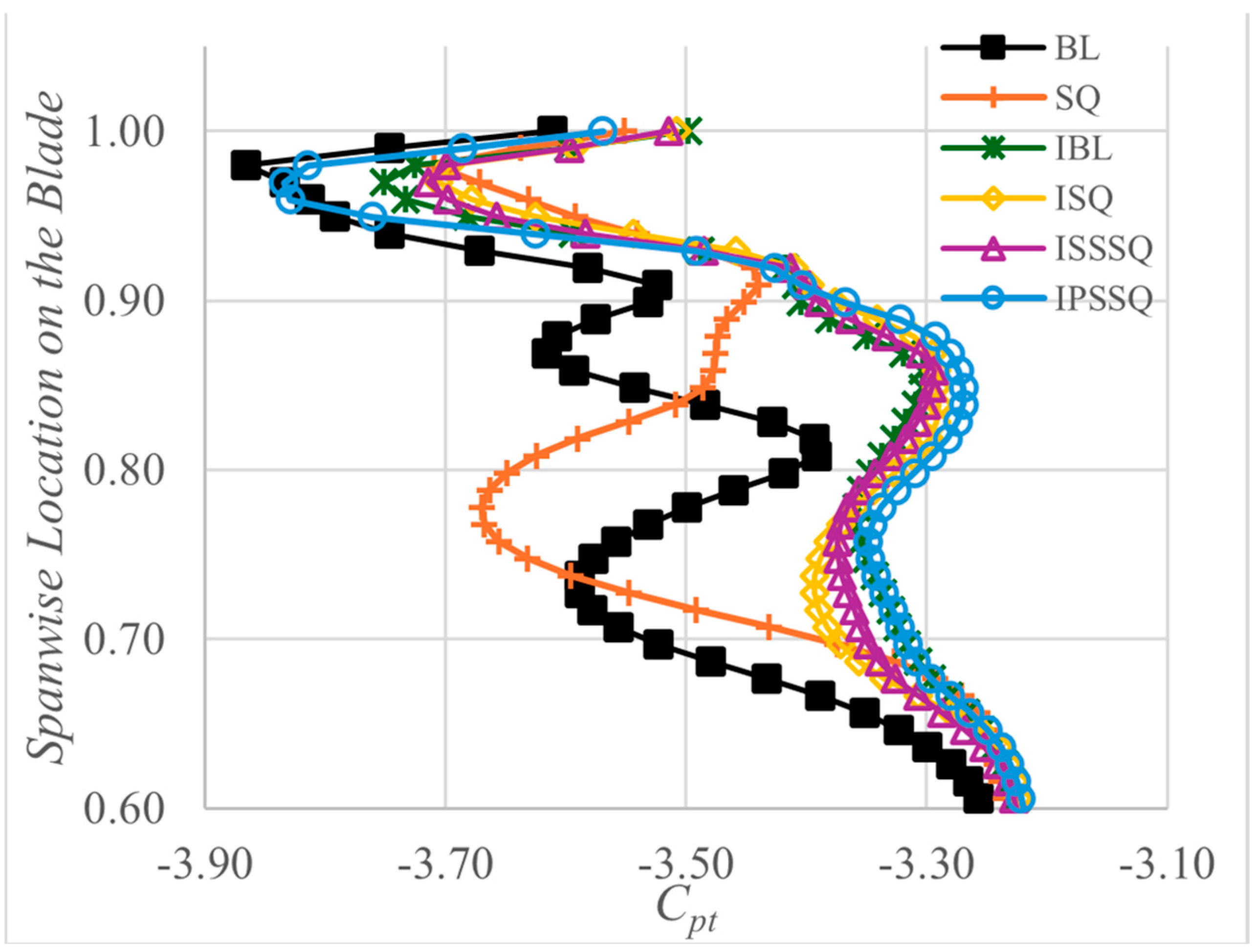 Cpt values in the spanwise direction for all squealer designs and the baseline case is shown in
