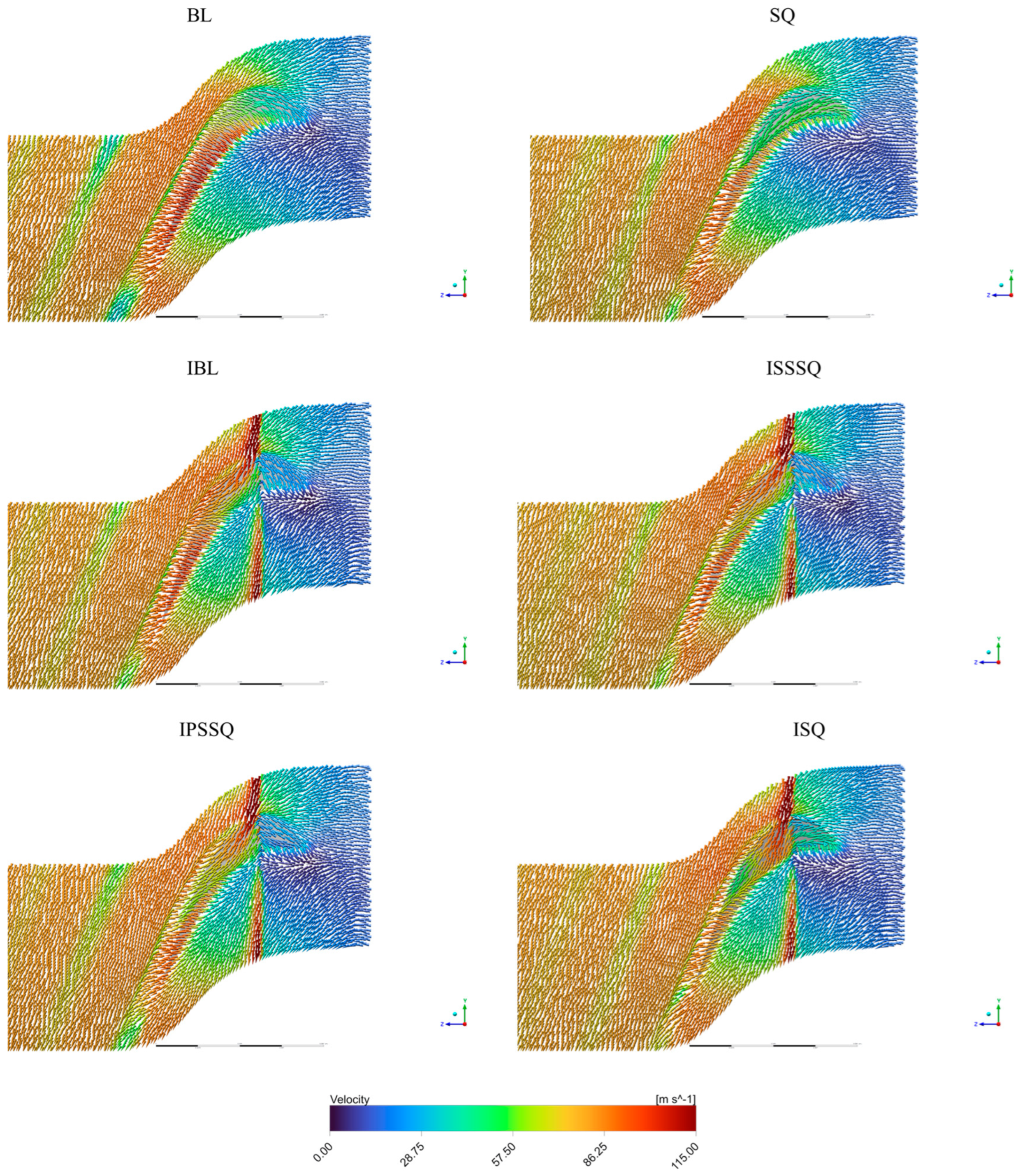 The suction-side squealer combined with injection (ISSSQ) provides strong TLV trapping. The TLV core is now nearly contained by the SS (suction side) cavity. The injection jet fills most of the gap, yielding a very uniform velocity field with minimal backflow. The TLV that does form is very compact and weak. Because the SS rib blocks the vortex exit, leakage flow is greatly reduced. A small, disturbed region near the SS is seen, but a smooth flow elsewhere. Overall, this design has much lower TLV strength and more uniform flow than BL at the expense of some concentrated vortex loss near the rib.
