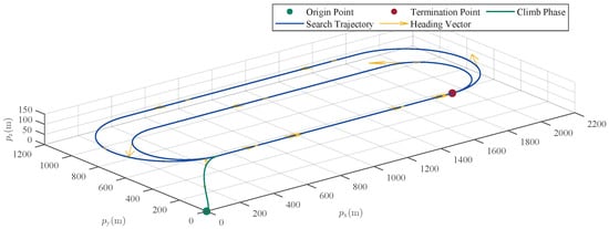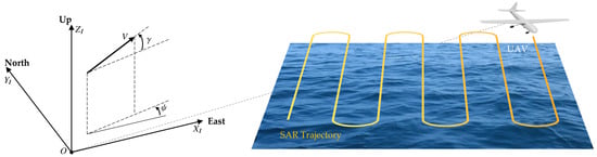 Throughout this paper, let denote the Euclidean norm. Let denote the identity matrix of appropriate dimensions, and represent a diagonal matrix. represents the minimum eigenvalue of matrix . For simplicity, the time variable t will be used flexibly when referring to time-varying signals. In some instances, t may be omitted for brevity. Figure 1 provides a schematic illustration of the SAR mission scenario. As depicted in the figure, the inertial frame is defined with its axes corresponding to the East, North, and Up directions. The velocity vector , velocity elevation angle , and velocity heading angle are also annotated in accordance with standard aerial vehicle kinematics.