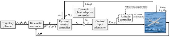 Block diagram of the overall hierarchical control architecture. The components and signals shown with solid lines represent the control law and simulation loop implemented in this paper, where the UAV dynamics (point-mass model) is directly driven by T, , and . The dashed components illustrate how the proposed controller would integrate with a conventional inner-loop attitude controller (autopilot) in a real-world application.
