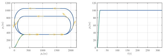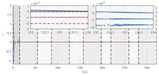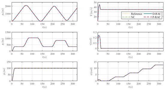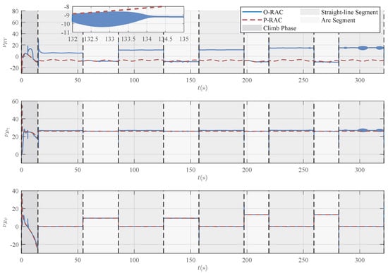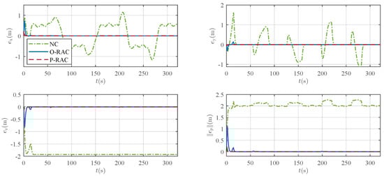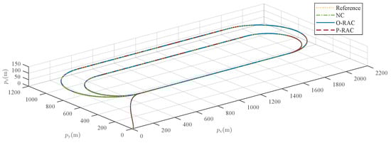 A detailed examination of the tracking error in Figure 10 reveals that the controllers exhibit significant differences in performance. The tracking under NC exhibits a relatively pronounced error, with a peak value exceeding 2 m, and a steady-state error of approximately 2 m is observed. In contrast, the tracking performance is substantially improved with the introduction of robust compensation in O-RAC and P-RAC. Specifically, they exhibit a faster convergence speed, ultimately settling the steady-state error within a small neighborhood of zero. As reported in Table 3, RAC demonstrates superior performance in terms of both max tracking error and RMSE, which are reduced to and of those under the NC, respectively. Moreover, the P-RAC further reduces the max tracking error and RMSE to and of those under the O-RAC, respectively. These quantitative results further confirm the superiority of the proposed RAC, especially P-RAC, in ensuring accurate trajectory tracking.