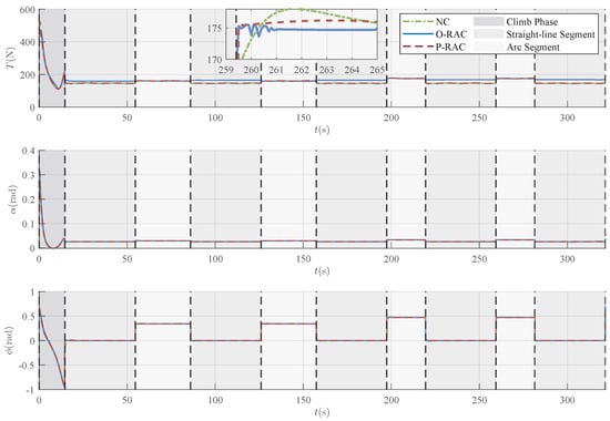 A more in-depth analysis of the control commands generated by the P-RAC, shown in Figure 11, provides insights into its practical feasibility for the simulated scenario. A noticeable peak occurs in the commands, particularly thrust T and AOA , during the initial transient phase (approximately ). For instance, briefly reaches a maximum around 0.32 rad (18.3 deg). This behavior is expected and dynamically consistent, reflecting the controller’s necessary effort to rapidly eliminate the large initial state error (starting velocity of 11 m/s vs. reference 35 m/s, plus altitude error). Crucially, after the UAV intercepts the trajectory, the commands settle into a much milder and smoother regime. For the remainder of the mission, the AOA stays within a very safe range of approximately 0.024 to 0.030 rad (1.4 to 1.7 deg), the bank angle required for turns remains within a moderate 0.66 rad (38 deg), and the thrust T varies smoothly, mostly between 140 N and 160 N. While these results are specific to the simulated scenario, the smoothness and the reasonable magnitude of the commands, especially during the cruising and maneuvering phase, strongly suggest that they represent a feasible operational envelope. It is reasonable to expect that a standard, well-tuned attitude controller could track these commands without encountering actuator saturation under similar flight conditions.