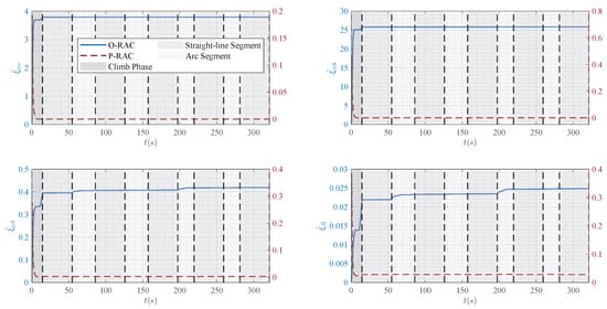 Furthermore, Figure 14 compares the evolution of the estimated parameters for the two RACs, further highlighting their intrinsic differences. For O-RAC, the update law (27) of the estimated parameters contains a pure integral action, which, under persistent disturbances, causes the estimated adaptive parameters to increase monotonically but still remain bounded. P-RAC, however, incorporates a decay term in its adaptation law. This ensures that the estimated parameters converge to bounded values, thereby enhancing the long-term stability of the system.