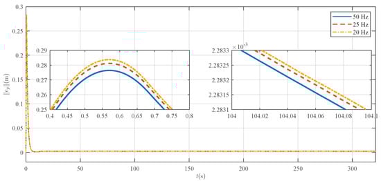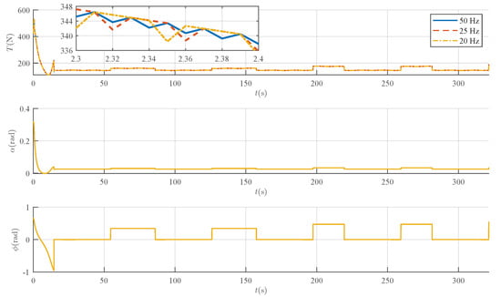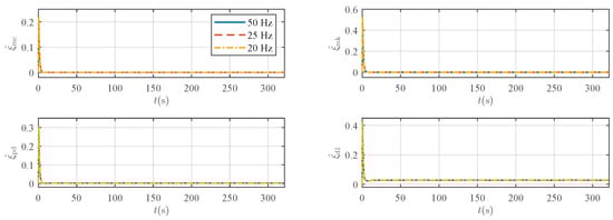 Figure 15, Figure 16 and Figure 17 show the comparative results for the system’s tracking errors, control inputs, and estimated adaptive parameters at these different sampling frequencies. In particular, the control signals corresponding to various sampling rates are clearly visualized in Figure 16.