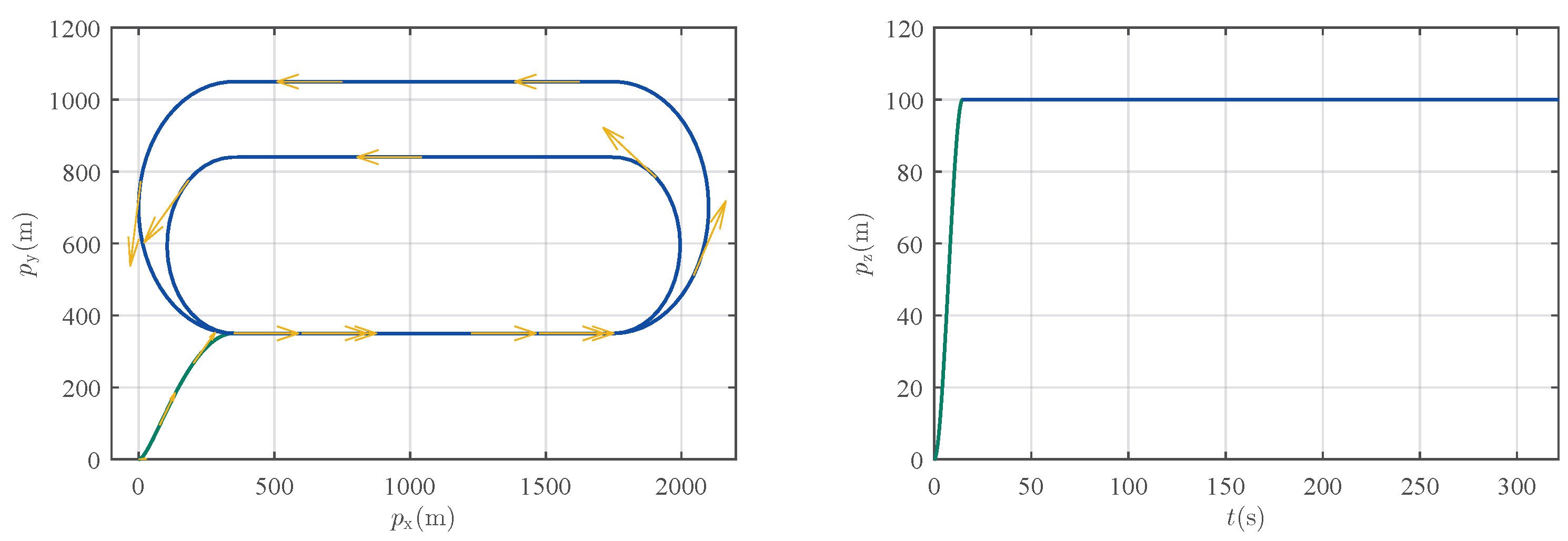 Figure 4, the reference trajectory follows a lawnmower pattern within a designated rectangular search area spanning 1400 m in length and 700 m in width. The trajectory geometry consists of segments with two different turning radii: the initial loop features 350 m-radius circular arcs connecting the 1400 m straight legs, while the subsequent loops utilize tighter, 245 m-radius circular arcs for the turns, maintaining the same straight segment length.