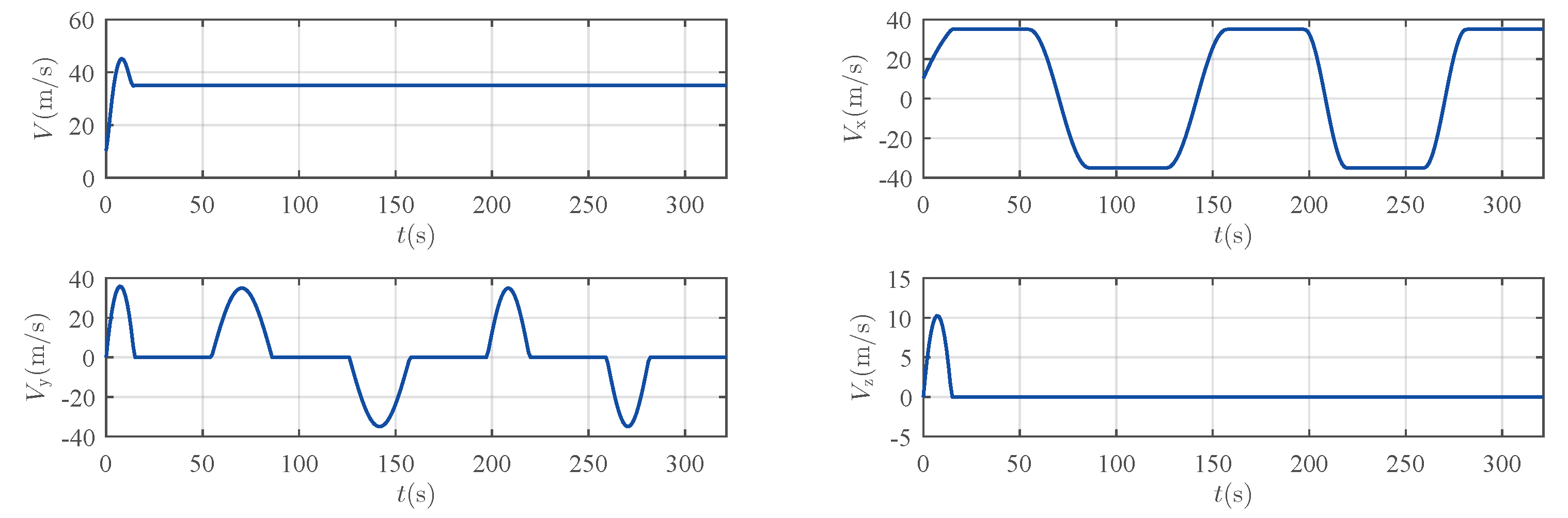 Figure 3 provides a visual representation of the time histories of these disturbance components. The objective was to evaluate the robustness and tracking performance of our proposed controller under such adverse conditions.